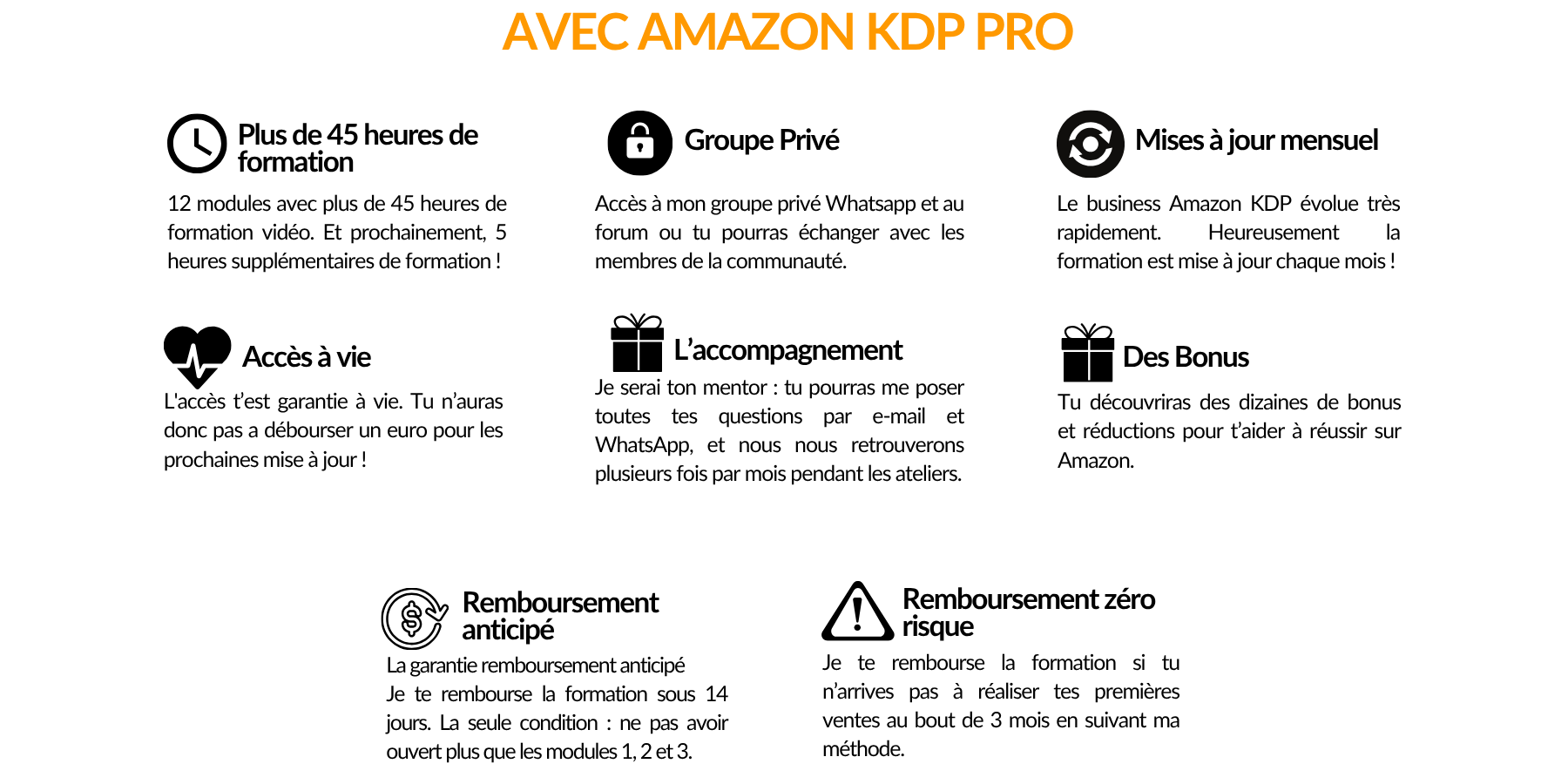La garantie de "remboursement sans risque" : Je te rembourse la formation si tu n'arrives pas à réaliser tes premières ventes au bout de 6 mois en suivant la méthode.
